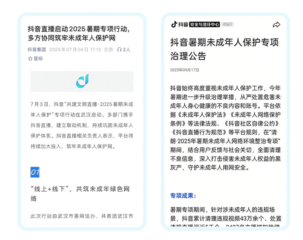 数据显示,抖音全年累计清理未成年人不良内容240万条,未成年人内容池精品适龄内容总量达680万条,专属栏目《共赴成长·未成年人陪伴周刊》收录内容播放量达13.7亿,“益童乐园”公益项目累计服务儿童超400万人次。
