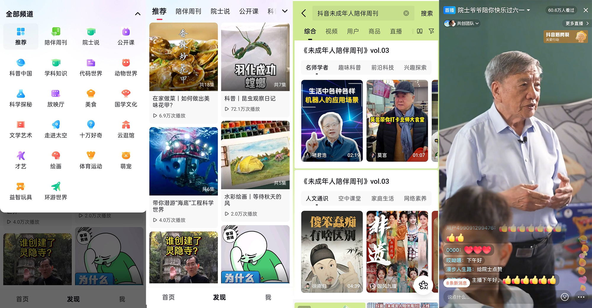 专属内容栏目《共赴成长·未成年人陪伴周刊》的推出,成为优质内容供给的重要载体。该栏目覆盖名师讲堂、趣味科普、前沿科技等八大板块,已累计更新3期,收录266条内容,播放量达13.7亿次。此外,抖音联合中国儿童中心发起“院士爷爷陪你过六一”科普直播,邀请中科院院士刘嘉麒以及平台多名科普创作者开展趣味直播,吸引84.4万人次观看,收获77.2万次点赞,让科学知识传播更具吸引力。
